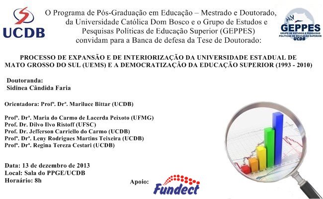 O Programa de Pós-Graduação em Educação – Mestrado e Doutorado, da Universidade Católica Dom Bosco e o Grupo de Estudos e Pesquisas Políticas de Educação Superior (GEPPES) convidam para a Banca de Defesa de Tese de Doutorado de Sidinea Cândida Faria intitulada: "PROCESSO DE EXPANSÃO E DE INTERIORIZAÇÃO DA UNIVERSIDADE ESTADUAL DE MATO GROSSO DO SUL(UEMS) E A DEMOCRATIZAÇÃO DA EDUCAÇÃO SUPERIOR (1993-2010)". A Banca Examinadora será composta pelos professores: Profª. Dra. Mariluce Bittar – UCDB (Orientadora, UCDB),